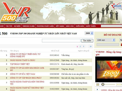 Ngày 25/11/2009, Báo điện tử VietnamNet kết hợp với Công ty Cổ phần Báo cáo đánh giá Việt Nam (Vietnam Report) vừa công bố bảng xếp hạng 500 doanh nghiệp lớn nhất Việt Nam và 500 doanh nghiệp tư nhân ...