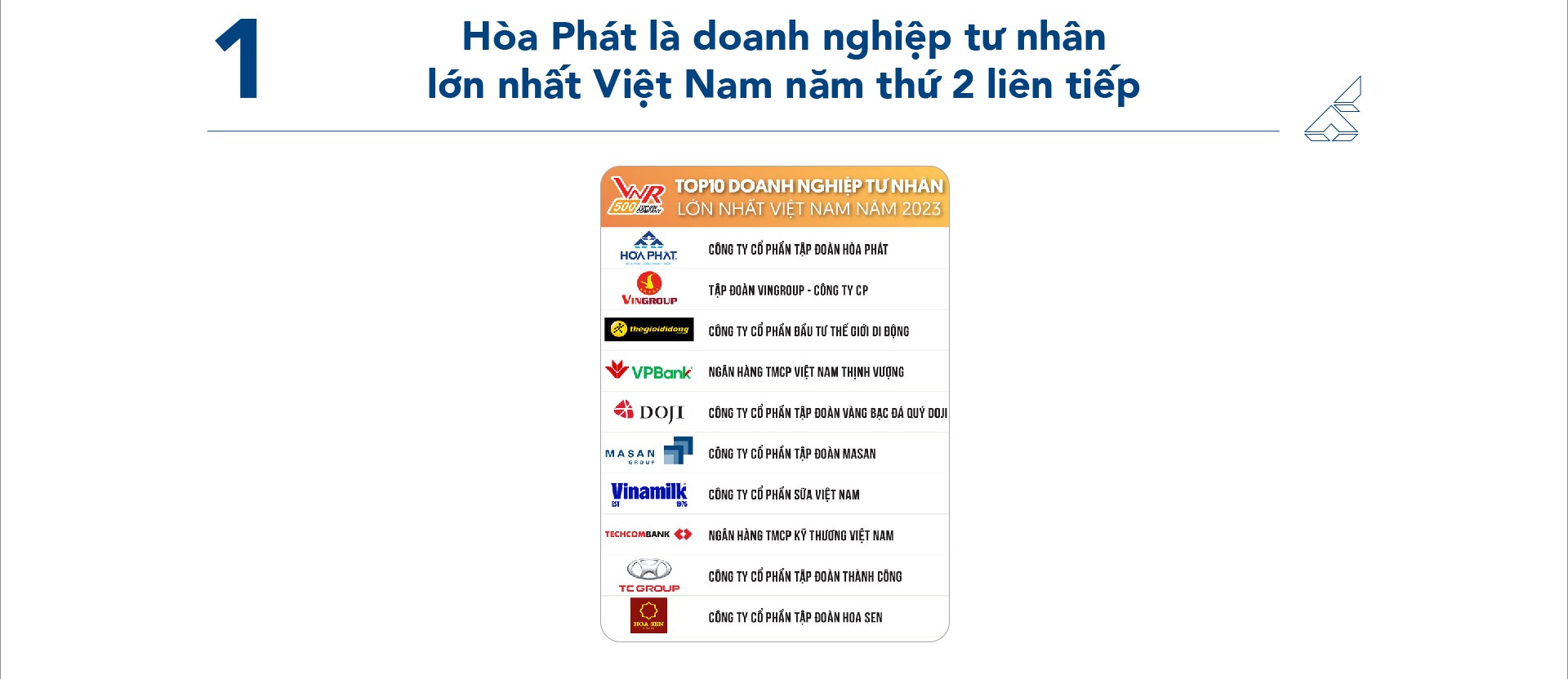 Theo công bố của Vietnam Report và báo VietnamNet tháng 11/2023, Tập đoàn Hòa Phát tiếp tục giữ vững vị trí số 1 trong Top 10 DN tư nhân lớn nhất Việt Nam năm thứ 2 liên tiếp và đứng thứ 8 trong Top 10 doanh nghiệp lớn nhất cả nước. Đây là năm thứ 16 liên tiếp Hòa Phát được vinh danh trong bảng xếp hạng những Công ty lớn nhất Việt Nam (VNR 500).