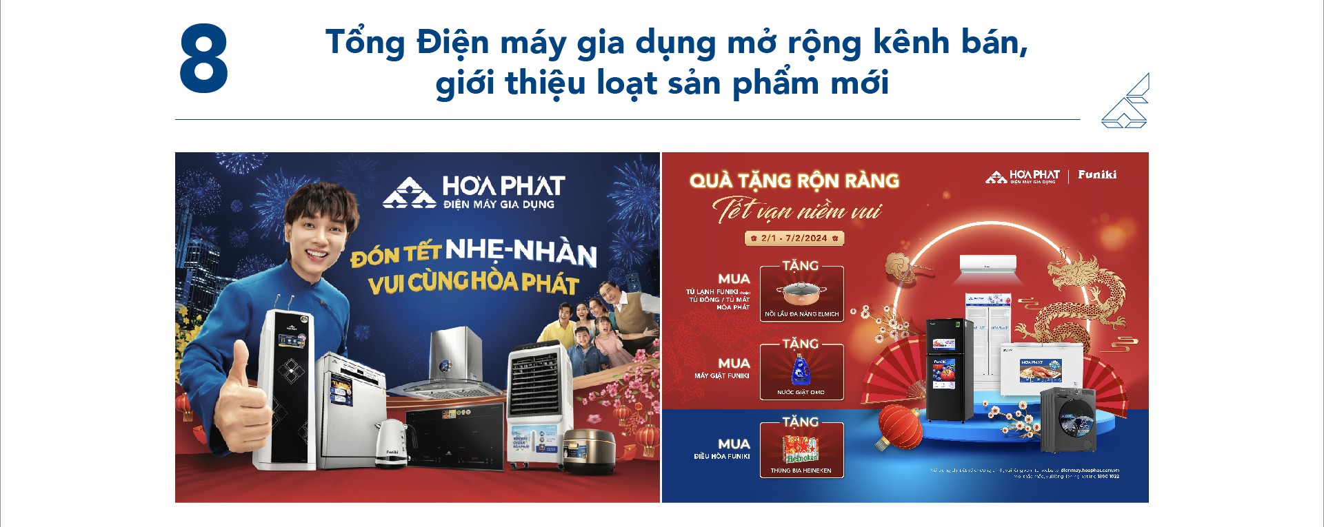 Năm 2023, ĐMGD Hòa Phát cũng đẩy mạnh hoạt động tiếp thị, giới thiệu sản phẩm, ký kết hợp tác chiến lược với kênh bán hiện đại như Điện Máy Xanh. Thương hiệu Điện máy gia dụng Hòa Phát và Funiki đã được phân phối đa kênh, từ các cửa hàng điện máy truyền thống tới chuỗi siêu thị Điện Máy Xanh, Chợ Lớn, Cao Phong, HC, Pico….tới các trang thương mại điện tử như Shopee, Lazada, Tiki…
