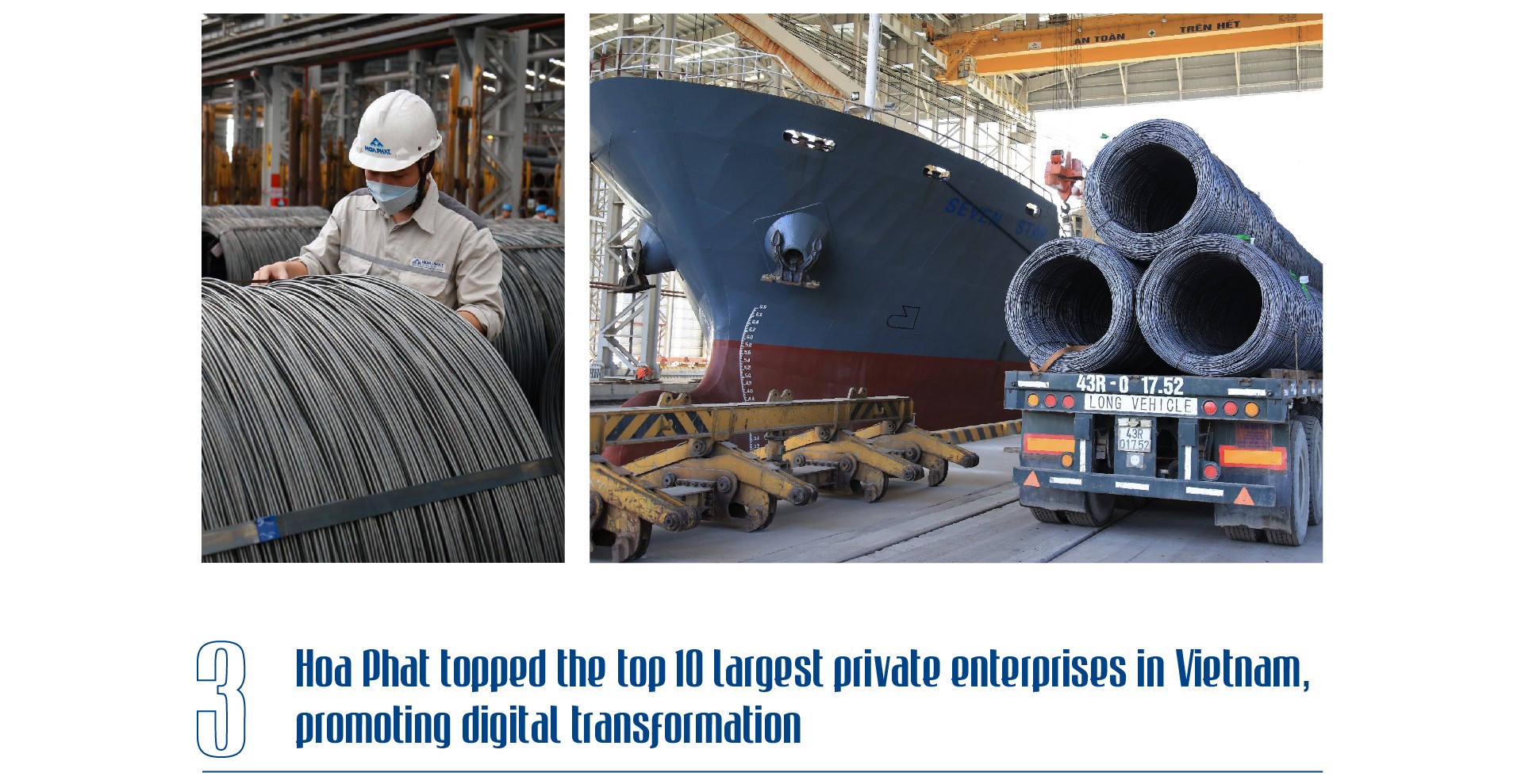 On November 15, 2022, Vietnam Report Joint Stock Company (Vietnam Report) partnered with VietnamNet Online Newspaper to announce the VNR500 Ranking - Top 500 Largest Enterprises in Vietnam in 2022. Hoa Phat Group ranked 1st in the Top 10 largest private enterprises in Vietnam for the first time, and 5th in the Top 10 largest enterprises in Vietnam in 2022.