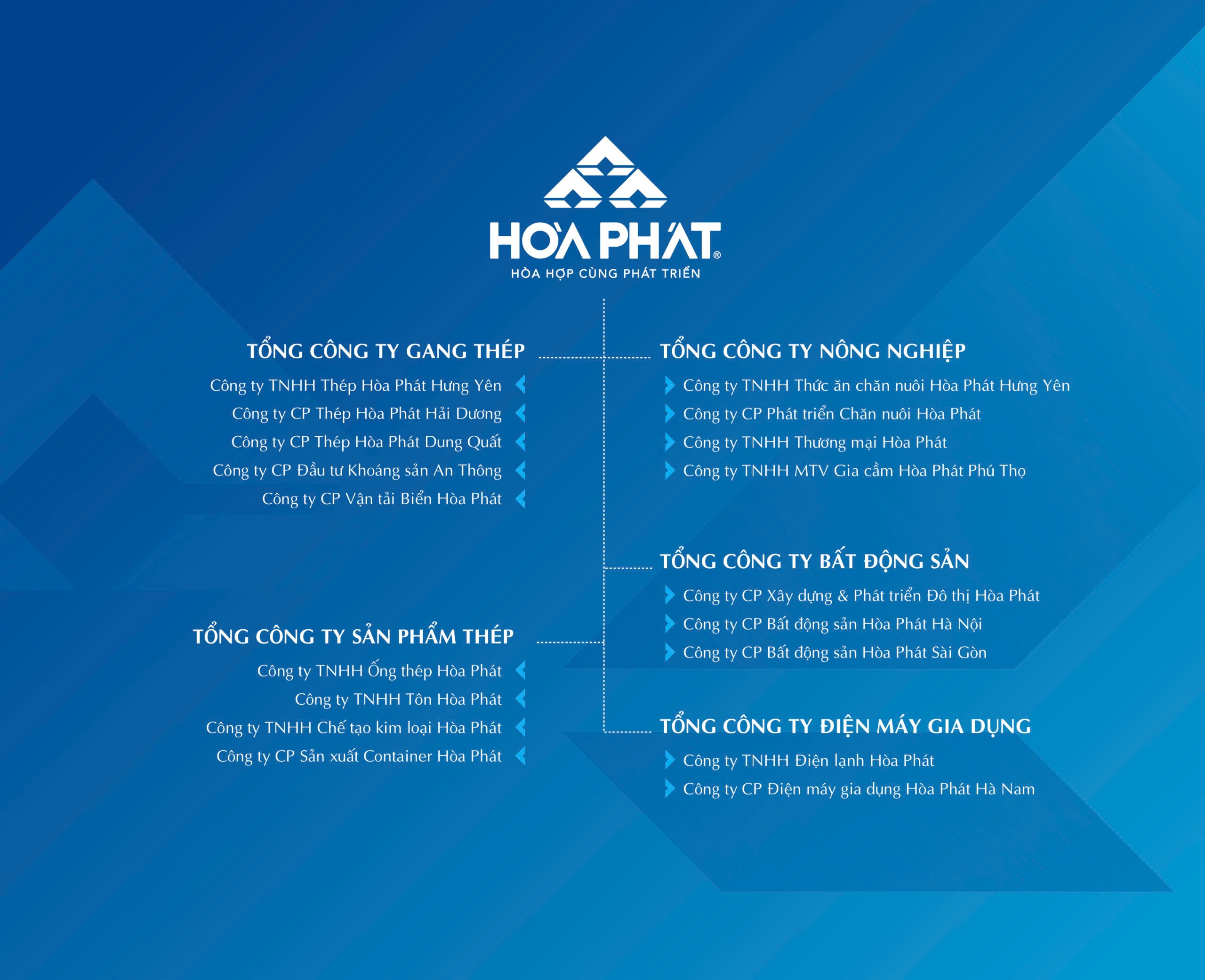 Hòa Phát là Tập đoàn sản xuất công nghiệp hàng đầu Việt Nam. Khởi đầu từ một Công ty chuyên buôn bán các loại máy xây dựng từ tháng 8/1992, Hòa Phát lần lượt mở rộng sang các lĩnh vực khác như Nội thất, ống thép, thép xây dựng, điện lạnh, bất động sản và nông nghiệp. Ngày 15/11/2007, Hòa Phát chính thức niêm yết cổ phiếu trên thị trường chứng khoán Việt Nam với mã chứng khoán HPG.