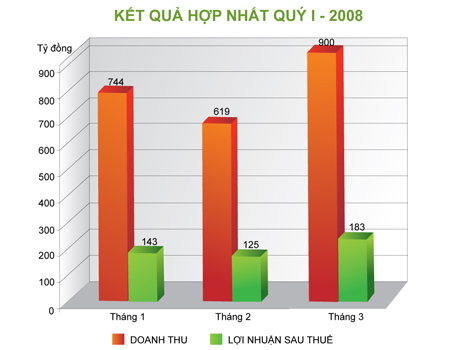 With this result, EPS of the first 3 months was 3.416 dong/share, EPS of four latest quarters was 7.649 dong/share. Business activities in the first 3 months 2008 reaches high growth and quite stably, percentage of profit after tax on turnover of the Group increases to 19% while which in 2007 was 11%.