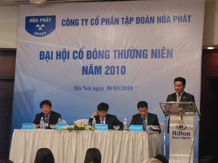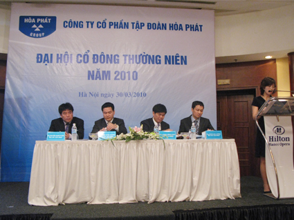 In the morning of March 30th 2010, at Hilton Hanoi Opera, 1 Le Thanh Tong, Hanoi, Hoa Phat Group Joint Stock Company held the Annual Meeting of Shareholders 2010 with the participation of shareholders who representing 149,433,002 stocks, equivalent to 76,099% of common stock.