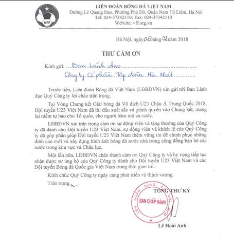 After completing necessary payment procedures, the bonus amount was transferred to the Viet Nam Football Federation. Mr. Le Hoai Anh, VFF"s general secretary sent a letter of thanks to Hoa Phat Group. Mr. Hoai Anh said that the timely encouragement of Hoa Phat Group helps the U23 team more confident to conquer new heights and build professional football image for Viet Nam.