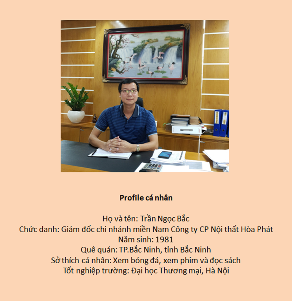 Đại diện cho lớp lãnh đạo trẻ nhiệt huyết, năng động với tư duy cởi mở, anh Bắc là người đóng góp công sức không nhỏ cho tăng trưởng của chi nhánh Nội thất Hòa Phát tại miền Nam. HPG News đã có cuộc trao đổi với anh Trần Ngọc Bắc để hiểu rõ hơn về quá trình “Nam tiến” và những tham vọng về khu vực thị trường này trong tương lai.