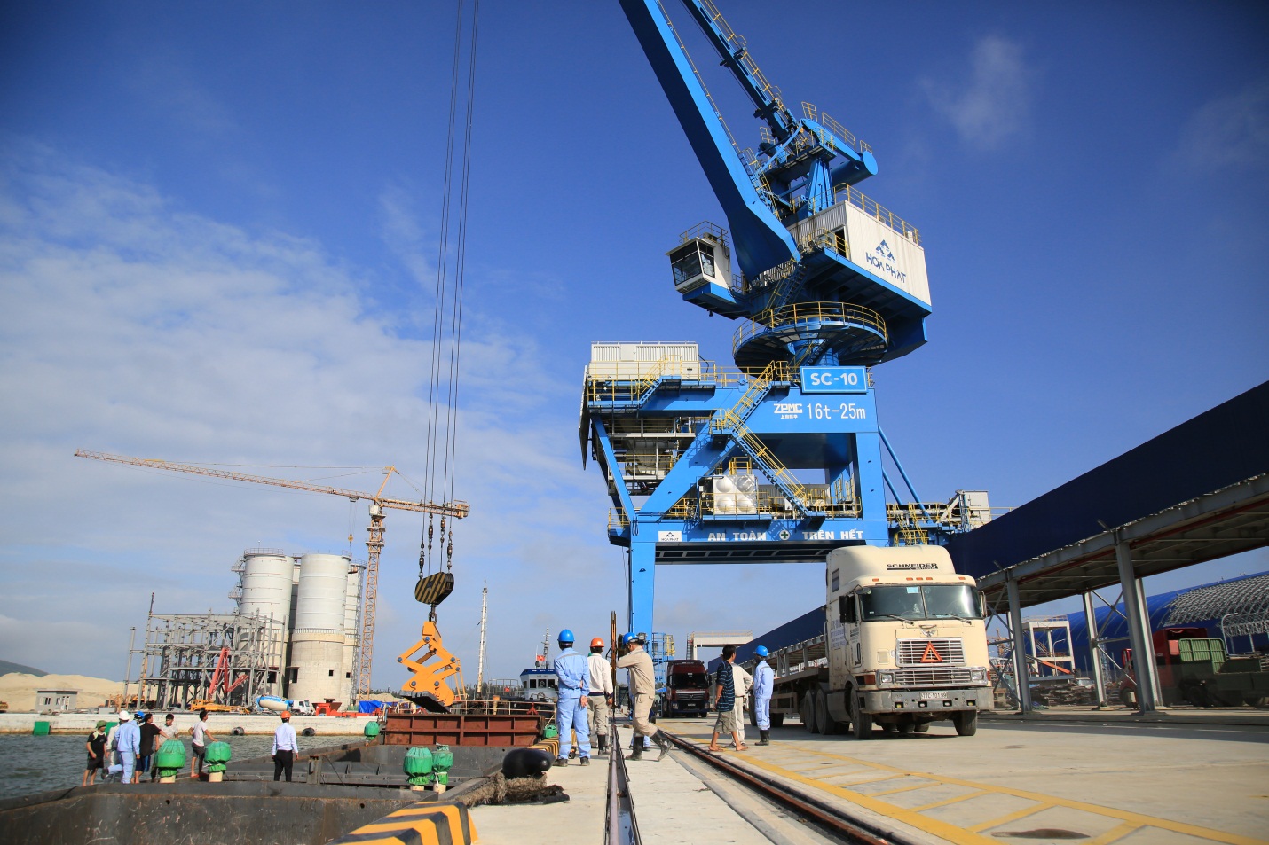 Bốc dỡ hàng từ tàu lên xe chuyên dụng tại Cảng Hòa Phát Dung Quất