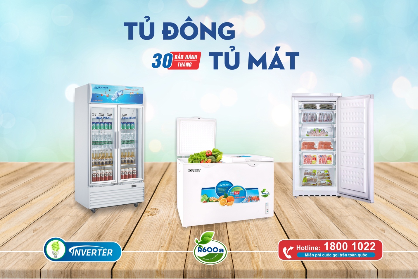 Bên cạnh dòng tủ đông truyền thống nằm ngang đang chiếm lĩnh thị trường, để đa dạng hóa sản phẩm, Điện lạnh Hòa Phát tung ra dòng sản phẩm tủ đông đứng mở cánh thẳng với ưu thế tiết kiệm diện tích, các ngăn đựng đồ riêng biệt giúp người sử dụng lấy đồ 1 cách dễ dàng. Các sản phẩm tủ đông đều được chuyển đổi dần từ gas R134 sang gas R 600A thân thiện với môi trường.