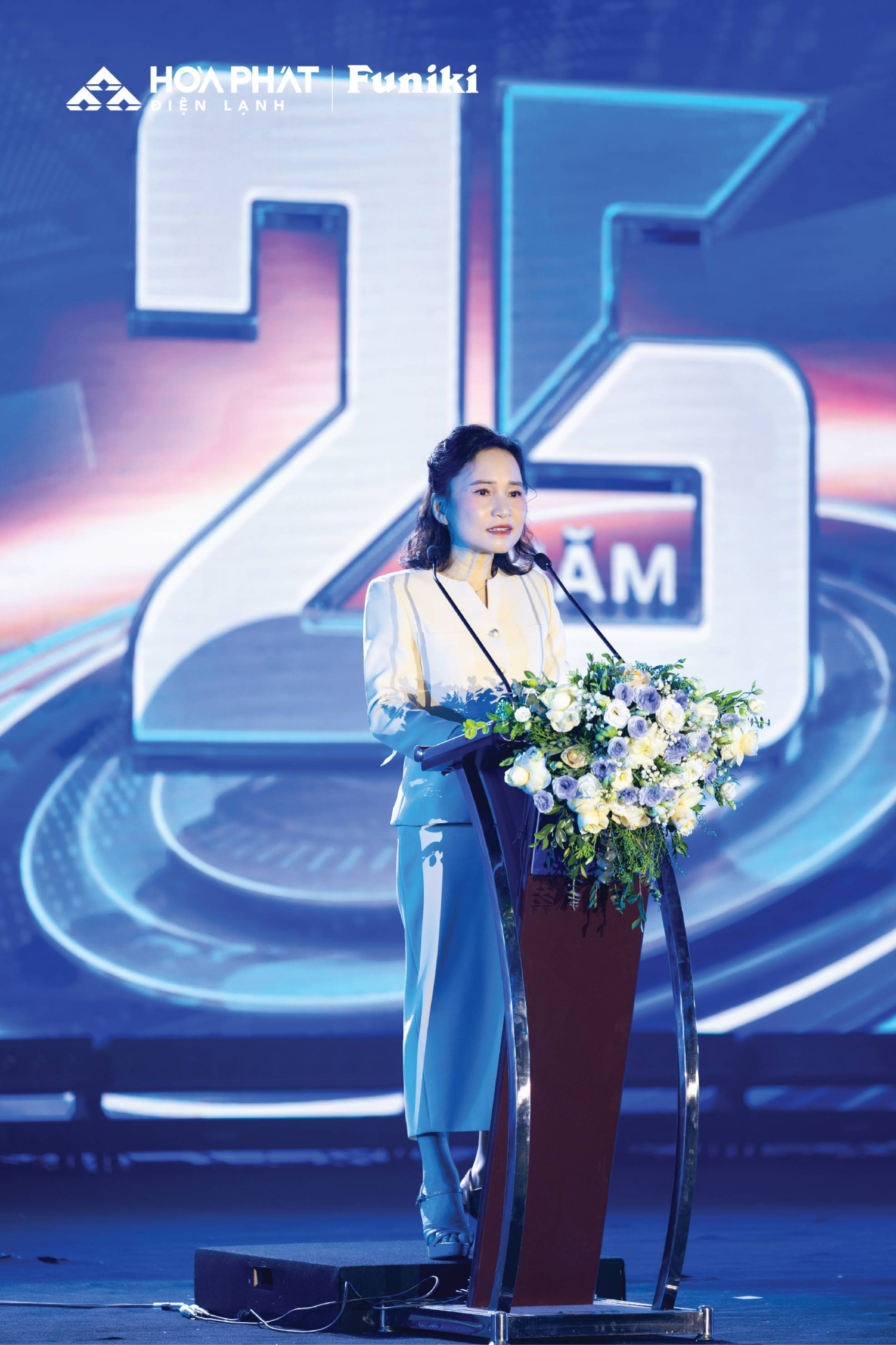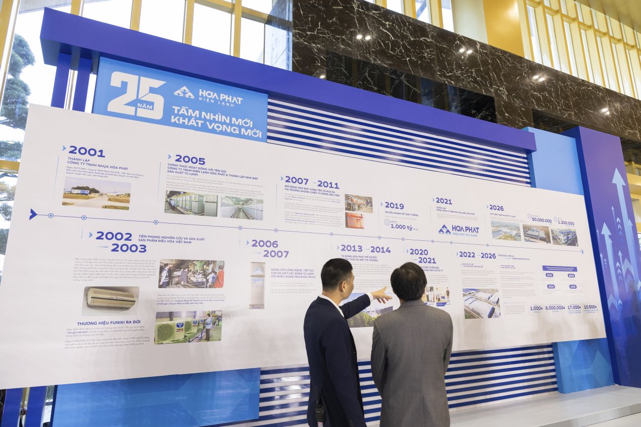 Vách lịch sử đầy tự hào, nơi lưu giữ những cột mốc đáng nhớ trong hành trình hình thành và phát triển của doanh nghiệpĐiểm nhấn của đêm sự kiện là màn trình diễn 3D Lighting tái hiện hành trình 25 năm bằng hiệu ứng hình ảnh và ánh sáng. Từ không gian văn phòng những ngày đầu đến hệ thống nhà máy với dây chuyền tự động và cánh tay robot hiện tại được dẫn dắt liền mạch trên sân khấu. Qua đó, khán giả có thể cảm nhận rõ hơn sự thay đổi về năng lực sản xuất, công nghệ và quy mô của Điện lạnh Hòa Phát sau nhiều năm xây dựng và mở rộng.