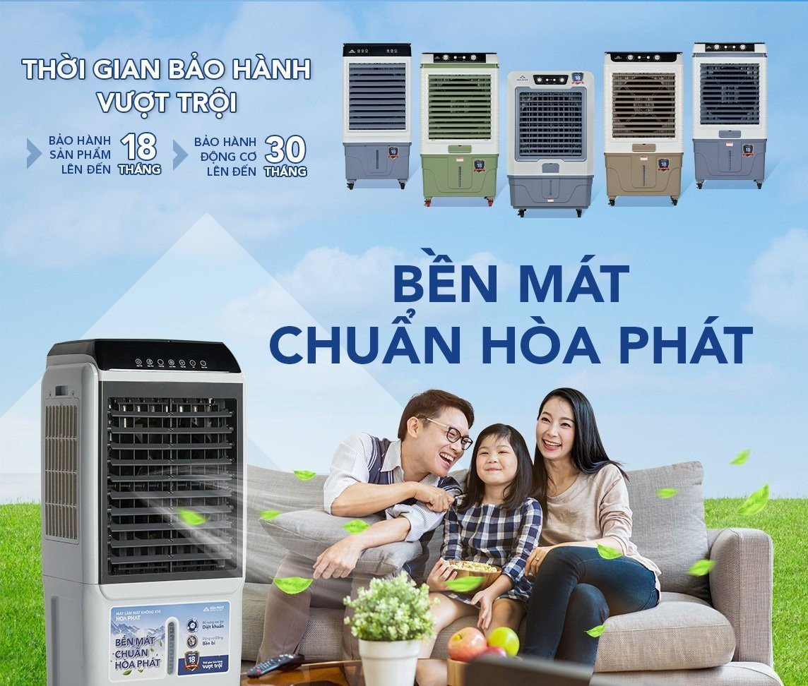 Máy làm mát Hòa Phát đa dạng về công suất và mẫu mã, vận hành bền bỉ, tiết kiệm điện, phù hợp không gian mởQuạt điều hòa - Máy làm mát không khí Hòa Phát được sản xuất tại Việt Nam theo tiêu chuẩn kiểm nghiệm nghiêm ngặt và quản lý chặt chẽ về chất lượng trong từng khâu sản xuất, với sự đầu tư toàn bộ khuôn nhựa, sản phẩm tập trung hoàn thiện chất liệu vỏ nhựa, đa dạng về công suất và mẫu mã… Đây là dòng sản phẩm được đánh giá cao nhờ khả năng làm mát vượt trội trong các không gian mở như nhà ở, văn phòng, sân bãi, vườn tược, nhà hàng, quán cafe…
