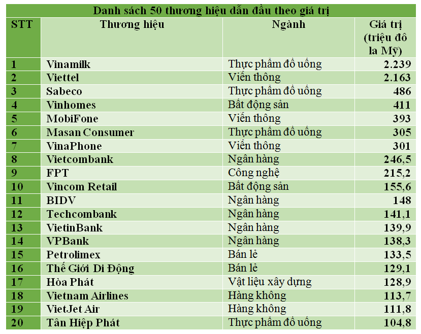So với danh sách năm 2018, danh sách năm nay có sự thay đổi khi mở rộng số lượng từ 40 thương hiệu lên 50 thương hiệu, phù hợp với sự phát triển của các doanh nghiệp và nền kinh tế. Bên cạnh đó, tuy giữ nguyên phương pháp tính toán nhưng danh sách được xếp theo từng ngành. Theo đó, sau khi phân theo lĩnh vực, các thương hiệu giá trị nhất theo từng ngành sẽ được lựa chọn từ trên xuống dưới.