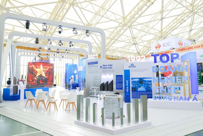 Tại triển lãm, Tập đoàn Hòa Phát giới thiệu hành trình 33 năm xây dựng và phát triển. Từ những bước khởi đầu đầy thách thức, Hòa Phát đã vươn lên trở thành doanh nghiệp thép số 1 Đông Nam Á, tương đương Top 30 thế giới với công suất thiết kế thép đạt 16 triệu tấn/năm từ cuối năm 2025, góp phần nâng tầm vị thế của Việt Nam trên bản đồ thép quốc tế.
