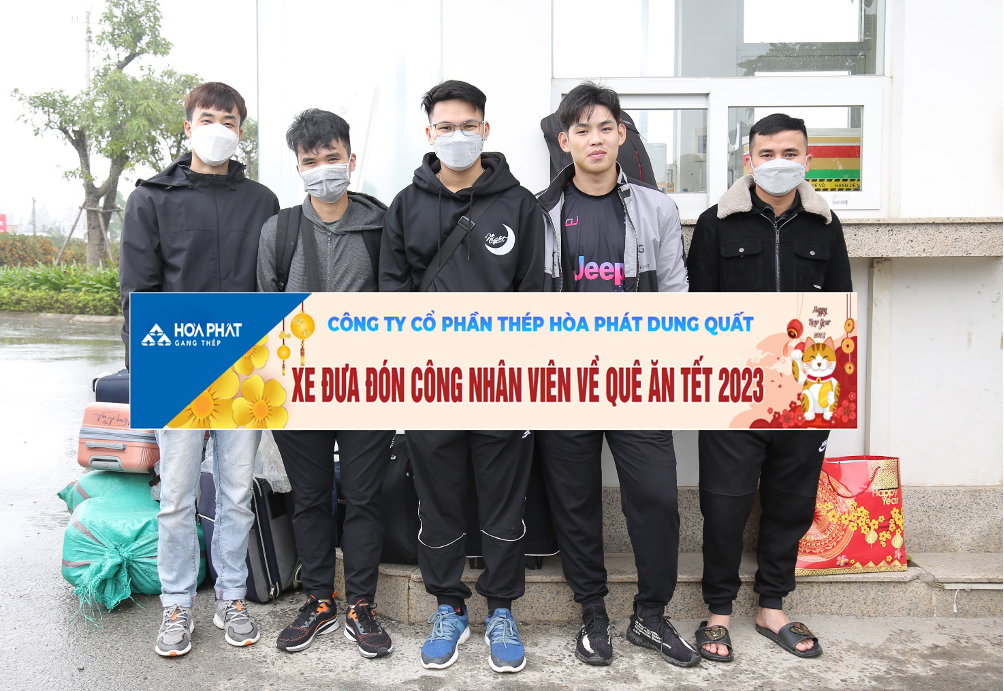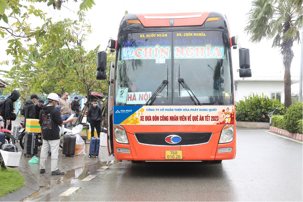Tại Công ty Thép Hòa Phát Dung Quất, năm nay CBNV Công ty được nghỉ Tết 7 ngày. Từ ngày 20/01/2023 (tức ngày 29 âm lịch) đến hết ngày 26/01/2023 (tức ngày mùng 06 âm lịch), Công ty đã tổ chức các chuyến xe đưa đón miễn phí đi theo ba hướng Bắc, Nam và Tây Nguyên để đưa đón gần 350 CBNV và người thân về quê với gia đình đón Tết sau một năm công tác và làm việc xa nhà.