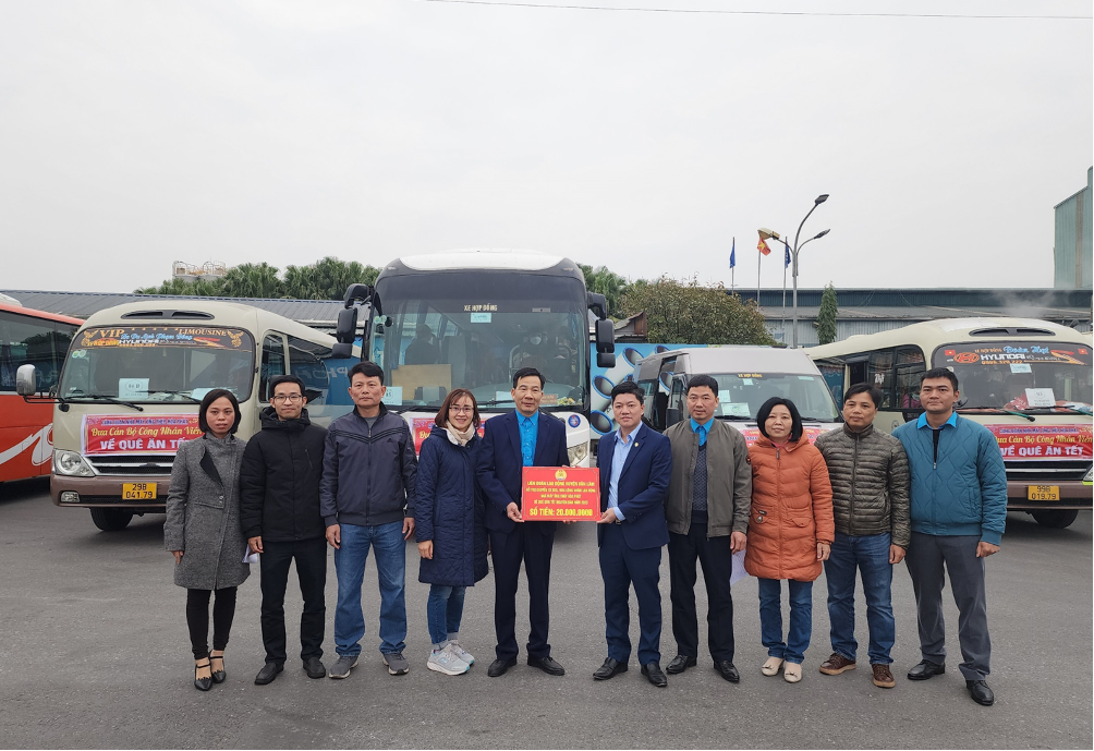 Năm nay, Liên đoàn Lao động huyện Văn Lâm hỗ trợ Công đoàn Nhà máy Ống thép Hòa Phát Hưng Yên 20 triệu kinh phí tổ chức thuê xe cho CBNV về quê ăn Tết. Ông Trịnh Trung Kiên, Chủ tịch LĐLĐ huyện Văn Lâm cũng đại diện LĐLĐ cấp trên trao tặng quà cho CBCNV Công ty trước khi lên 7 chuyến xe Công đoàn về sum họp cùng gia đình.
