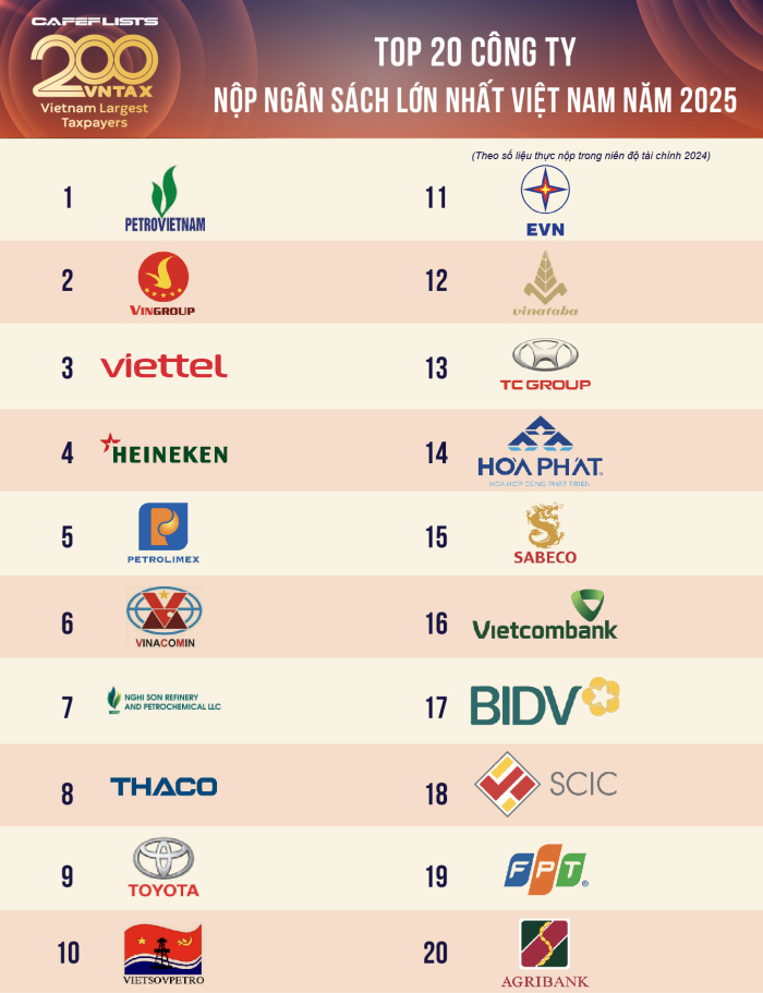 Bảng VNTAX 200 - Top 200 doanh nghiệp nộp ngân sách lớn nhất Việt Nam năm 2025, Tập đoàn Hòa Phát xếp thứ 14 và là một trong 4 doanh nghiệp tư nhân có mặt tại Top 20 Công ty nộp ngân sách lớn nhất.