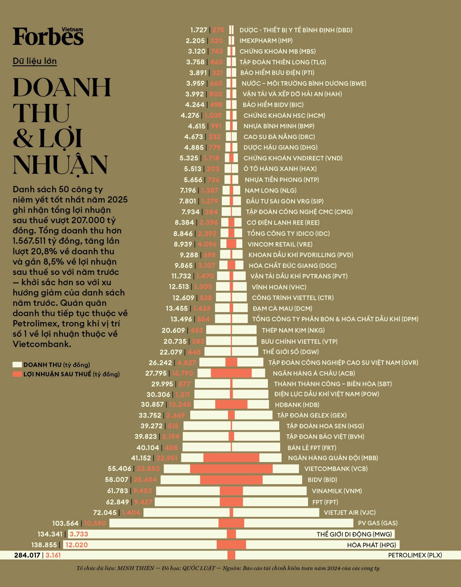 Forbes Việt Nam vừa công bố danh sách 50 công ty niêm yết tốt nhất năm 2025 dựa trên báo cáo kết quả tài chính kiểm toán năm 2024. Tập đoàn Hòa Phát có doanh thu lớn thứ 2 trong Top 50 Công ty niêm yết và lần thứ 13 liên tiếp có mặt trong danh sách này.