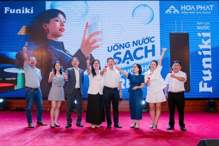 Đại diện Ban Lãnh đạo hai bên cùng nâng ly đánh dấu những sự hợp tác mới với các đại lý tham gia sự kiệnKhách mời tham dự được chia thành từng nhóm để tham quan nhà máy sản xuất Điện máy Gia dụng Hòa Phát Hà Nam. Tại đây, các đại lý phân phối trực tiếp quan sát dây chuyền sản xuất hiện đại và trải nghiệm kiểm tra chất lượng nước đầu ra của máy lọc nước Hydrogen ion kiềm RO nóng lạnh Funiki FP605A. Kết quả đo kiểm cho thấy các chỉ số đều đạt chuẩn và nằm trong mức an toàn như: