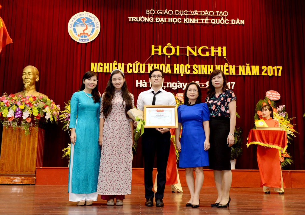 Bà Nguyễn Thị Thảo Nguyên - Phó Tổng giám đốc tặng giấy khen cho nhóm sinh viên thực hiện công trình NCKH đoạt giải Nhất tại trường KTQD
