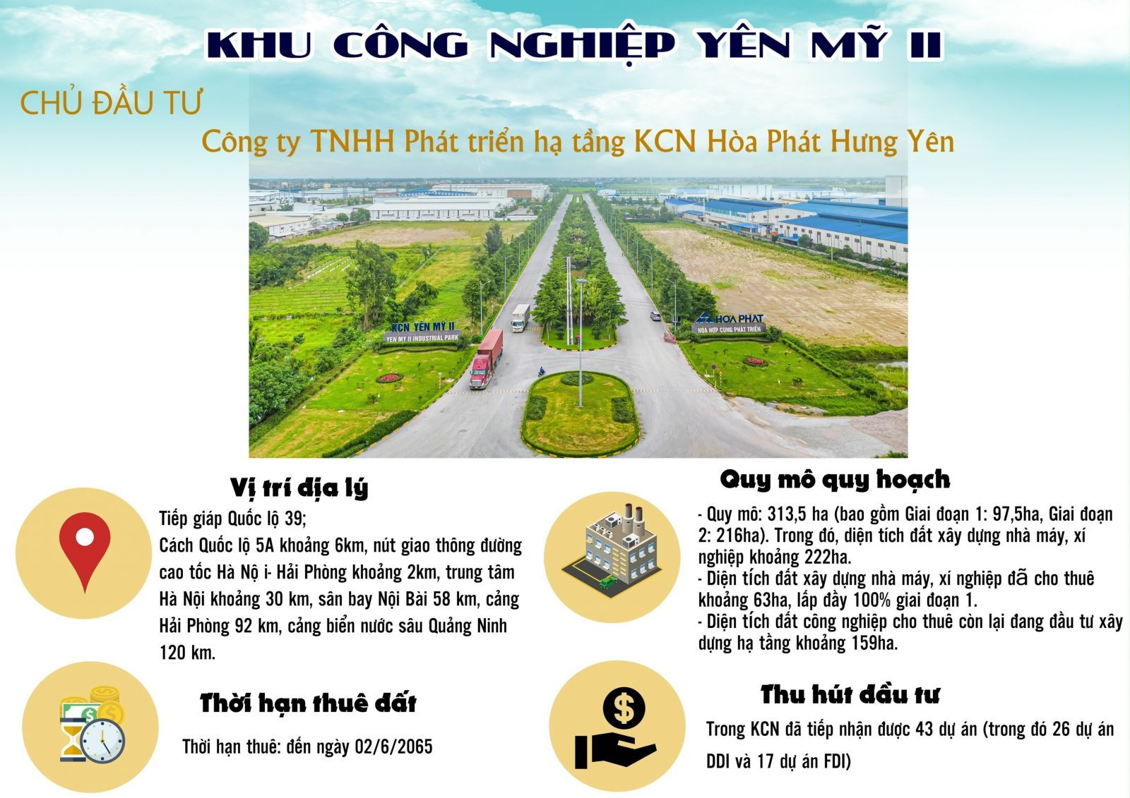 Trong năm 2023, Công ty TNHH Phát triển hạ tầng KCN Hòa Phát Hưng Yên đang triển khai giải phóng mặt bằng và thủ tục giao đất thuộc giai đoạn mở rộng của KCN Yên Mỹ II nhằm tạo đủ quỹ đất phục vụ hoạt động kinh doanh. Đồng thời, tiếp tục đẩy mạnh thu hút đầu tư, trong đó ưu tiên các nhà đầu tư mới với hàm lượng công nghệ cao và thân thiện với môi trường cho KCN Yên Mỹ II.