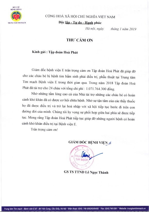 GS.TS Thầy thuốc nhân dân Lê Ngọc Thành, Giám đốc bệnh viện E kiêm Giám đốc Trung tâm tim mạch đã gửi thư cảm ơn và chia sẻ: Nhờ tấm lòng cao cả của nhà tài trợ, các cháu bé có hoàn cảnh khó khăn đã có được cơ hội chữa bệnh. Nhờ sự tận tâm của các thầy thuốc họ đã được điều trị và trở lại hòa nhập với xã hội tiếp tục bước đi trên đường đời của mình.