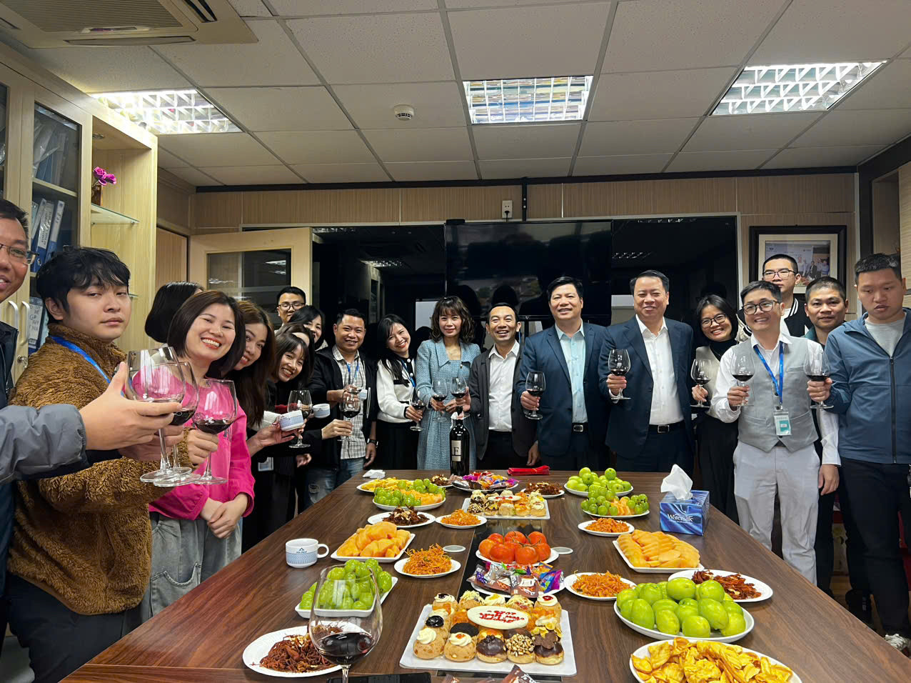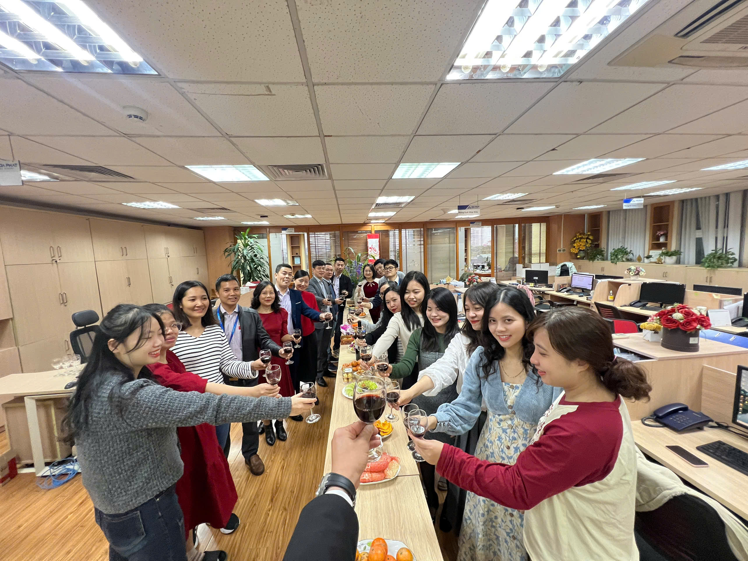 Tại văn phòng Công ty Thức ăn Chăn nuôi Hòa Phát Hưng Yên, Ban lãnh đạo cùng các nhân viên nâng ly chúc mừng năm 2025 với hy vọng năm mới nhiều thắng lợi