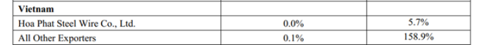 Trong khi đó, các doanh nghiệp xuất khẩu khác của Việt Nam, Trung Quốc, Đài Loan, Ấn Độ, Ý, Tây Ban Nha chịu mức thuế dao động từ 42,7% đến 158,9%.