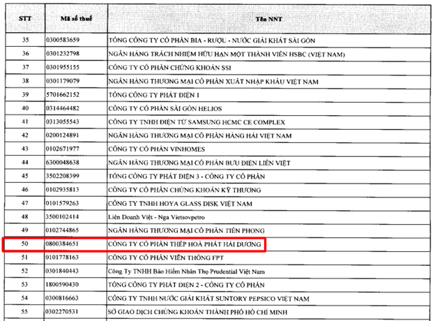 Thép Hòa Phát Hải Dương xếp thứ 50 trong danh sách V. 1000 năm 2022 của Tổng cục Thuế