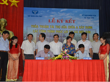 Chiều 25/9/2015, Tập đoàn Hòa Phát và UBND xã Hiệp Sơn (Kinh Môn – Hải Dương) đã tổ chức lễ ký thỏa thuận tài trợ sửa chữa và xây dựng các công trình phúc lợi trên địa bàn xã. Đây là một trong những ...
